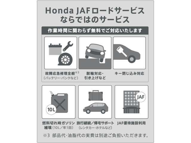 | 補足 | - | JAFとの提携で対象範囲と内容が広がり、より安心なロードサービスに!ご加入いただくと、会員本人だけでなく契約車両であればどなたでも、手厚いサービスをお受けいただけます。詳しくはスタッフまで。 |