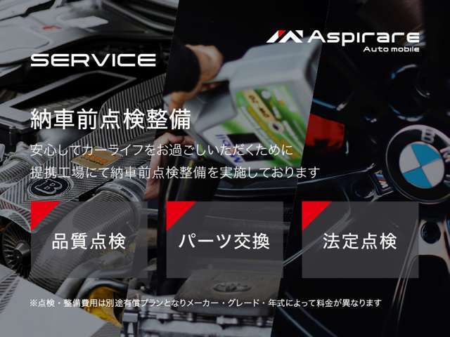 | 補足 | - | ボディコーティングプランとなります。※コーティング種類・車両サイズによって金額が異なります。 | 法定点検・消耗品交換をご要望に応じて取り付けを承ります。 ※車種によって金額がことなる場合がございます。 |