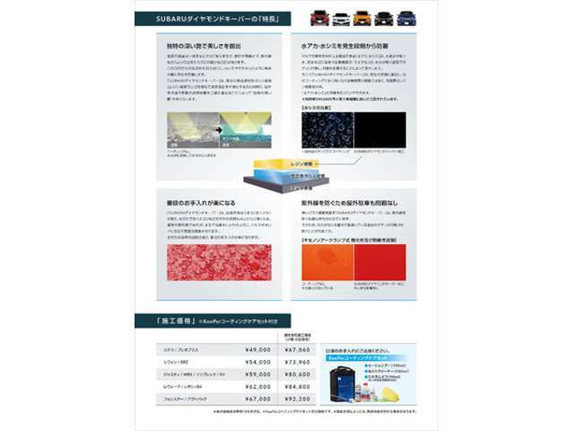 | 補足 | - | 快適空間に必須!お客様からのご要望の多いフロアマット・プレミアムエアコンフィルター・エバポレーター清掃 をSETにしたお買い得なパッケージとなります! | 新品マット・エアコンフィルター・ナンバー&ホイールロックをセットにしたU-Carベースキットと人気純正ボディコーティング『SUBARUダイヤモンドKeePer』『樹脂フェンダーKeePer』をセットにした人気プランです! |