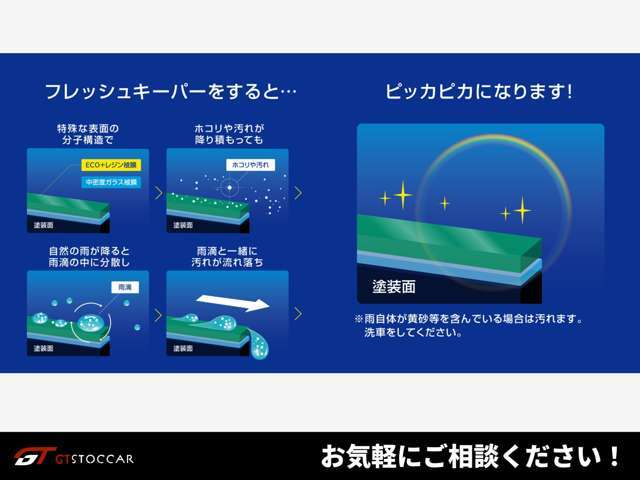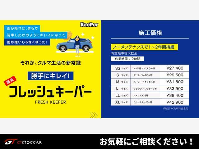 | 補足 | - | 【下回り塩害ガード施工】融雪剤はもちろん『雨や酸素』でも錆びが発生します!使用する溶剤は「油性シャーシ塗料」。水性塗料よりも油性は高耐久なためおすすめ塗料です。※マフラー施工は別途対応となります。 | 【KeePerコーティング】話題の人気コーティングの施工が可能です!艶を出し楽に車をきれいに保てます!※基本プランは中古車の車体表面の傷等は現状での施工、ご納車となります。 |