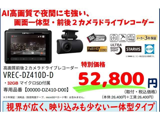 | 補足 | - | 安心のロードサービスJAFがついたプランです。 | カロッツェリア製前後ドライブレコーダー。電源コードセット付き!!VREC-DZ410D-D |